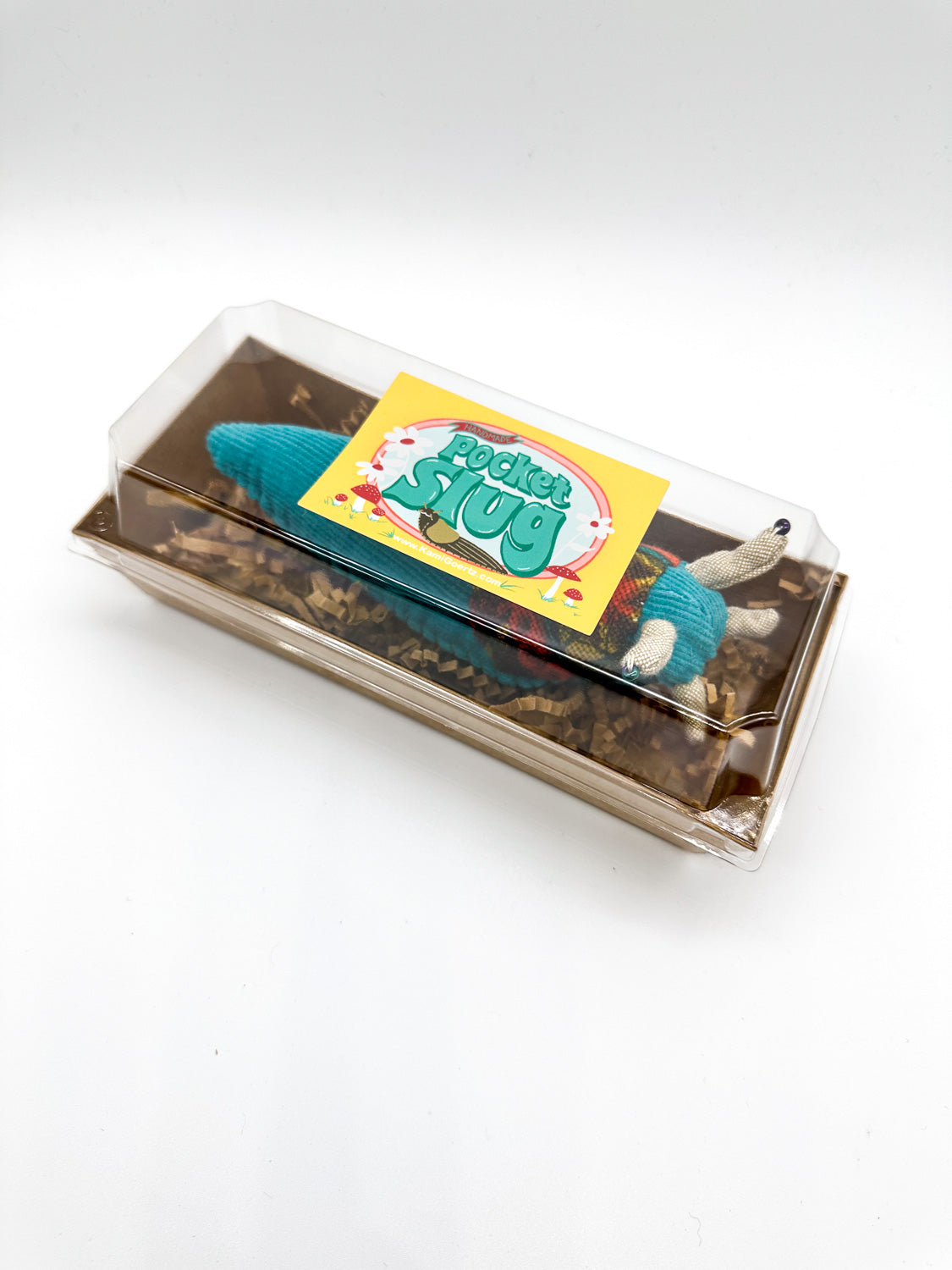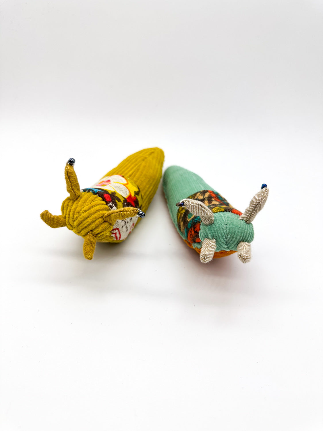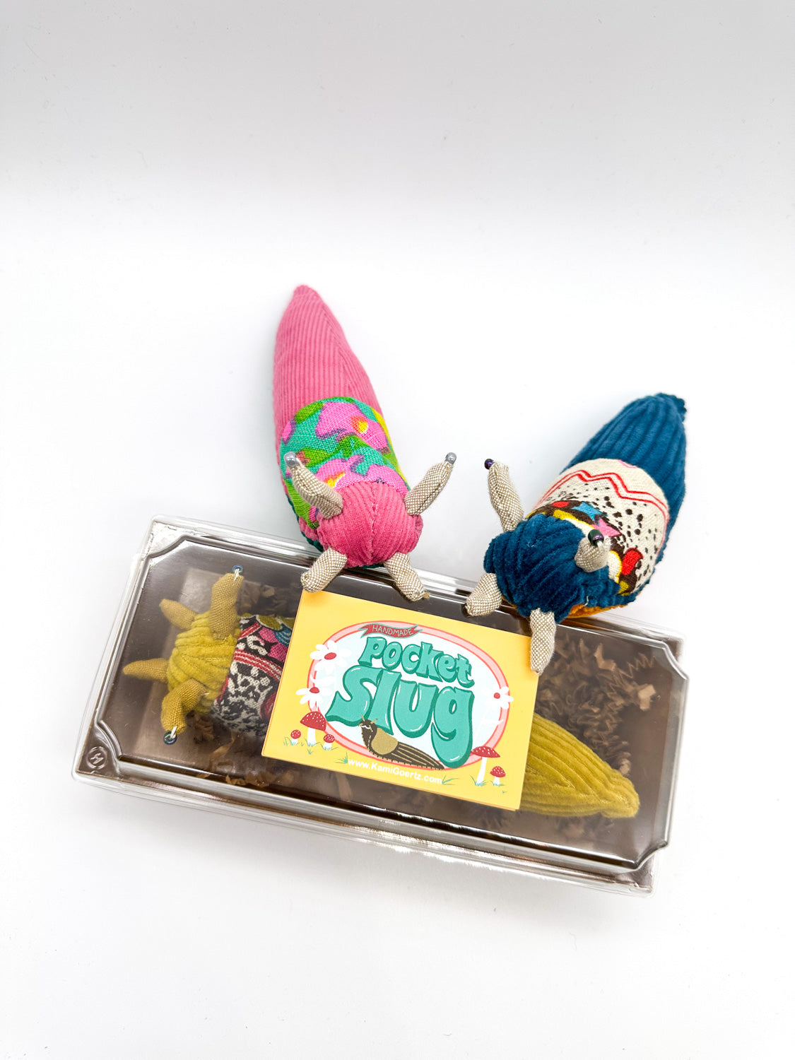 Adopt a pocket slug! These beautiful handmade creatures come to us from Toronto-based textile artist Kami Goertz. Described by the artist as "soft action figures," each one is a unique combination of fabrics, including vintage prints and corduroy. These sweet slugs have the antennae and details to charm any insect or textile art enthusiast!